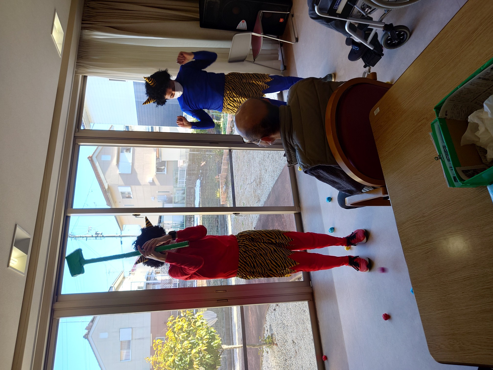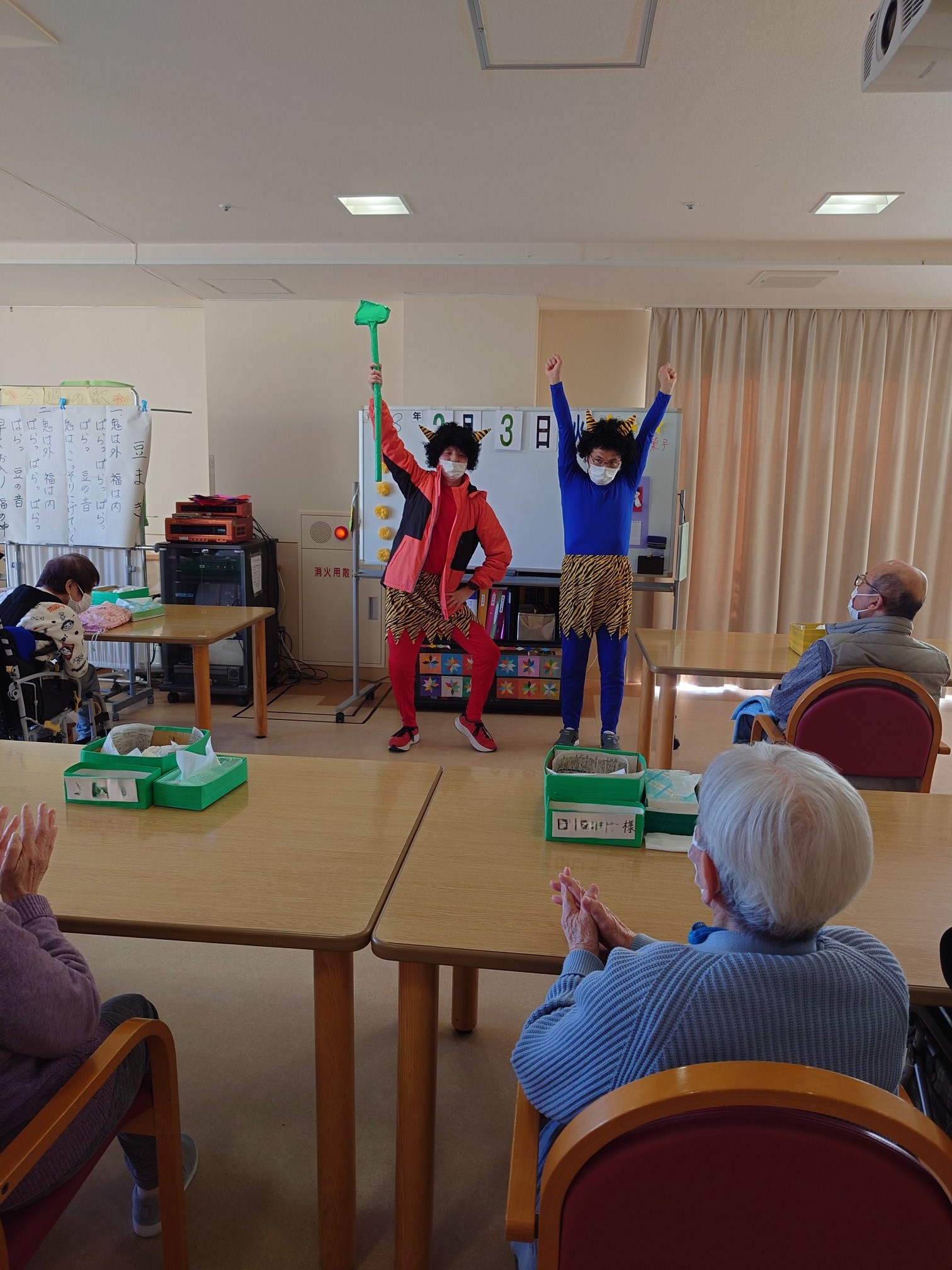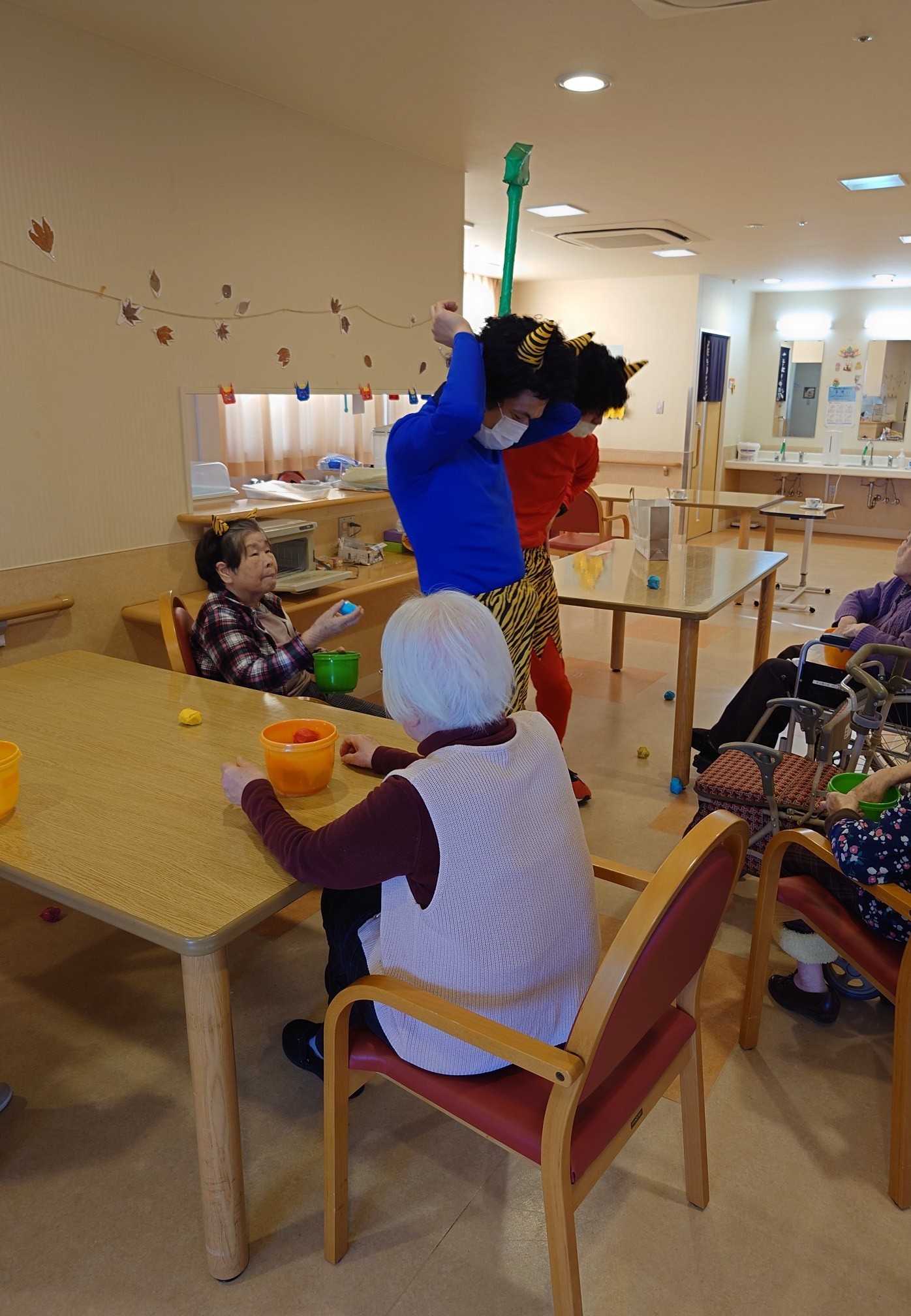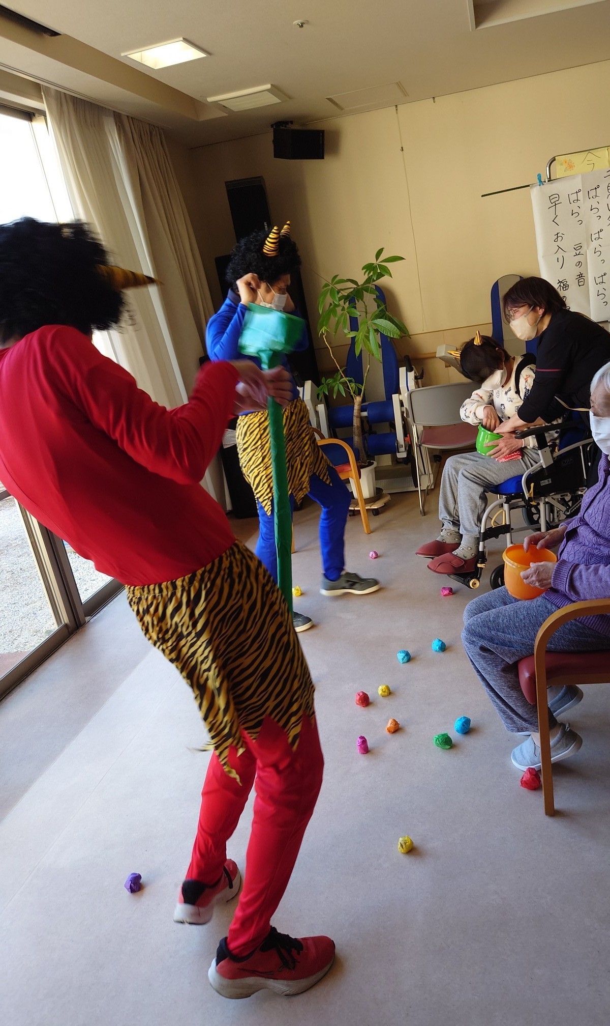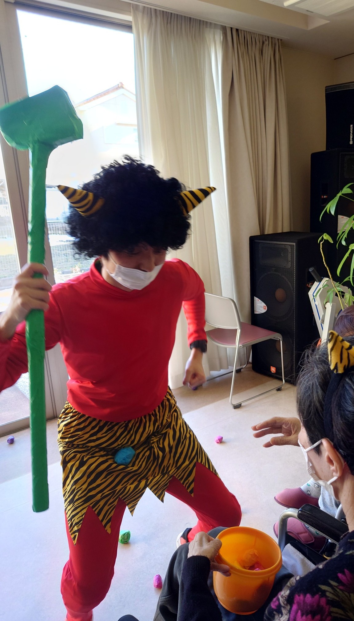 しっかり邪気を払おうと、赤鬼さん青鬼さんは施設の中を順番にまわってくれました!